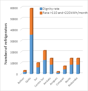 systems, it grew 16% [14]. It is important to mention that since 2013, projects with renewable energy sources connected to the National System have been incorporated, such as the Villonaco wind project and several photovoltaic parks. 2.2. Electricity demand in Ecuador. The electricity demand in the period of 1999-2011 had a growth rate of 5.8%. By February 2015, the total consumption, including technical and non-technical distribution losses, was 21,352.70 GWh, of which 6,537.42 GWh were from residential consumption, 3,873.93 GWh were from commercial consumption, 5,834.17 GWh were from industrial consumption, 1,046.39 GWh were from street lighting consumption, and 1,882 GWh were from other consumption sources [12]. The technical and non-technical distribution losses in the electrical consumption were 1,736.08 GWh (8.13%) and 892.70 GWh (4.18%), respectively (see Table 3). According to the 2010 Population and Housing Census by the National Institute of Statistics and Censuses (Instituto Nacional de Estadísticas y Censos - INEC), the total percentage of dwellings with electric power reached 94.77%, in the urban area, while it was 89.03% in rural areas [15]. The Guayas province has the highest number of subscribers, the same as in the year 2010, when 43,548 households without access to electricity it ware recorded, which corresponds to approximately 5% of the provincial total. These problems are also evident in other provinces, especially those that are located in the eastern part of the country. In this regard the Ministry of Electricity and Renewable Energy - MEER According to the institutional strategic plan 2014-2017, aims to cover 96,88% of the national electricity service of the public distribution. Until 2010, the characterization of the consumption of end uses of electricity for residential customers of Ecuador had not been updated, therefore it had only the study conducted in 1991 and data was insufficient to be used as a basis for the development of the domestic refrigerators renewal plan. For this reason in 2010 MEER, through consultancy, conducted a new analysis of some cities’ energy consumption in lighting, cooling, water heating and other (in this category is cooking with electricity) and determined that residential consumption in Ecuador for the 2010 represented 35% of the national electrical consumption [16]. The development of the study of end uses of energy was based on the measurement and construction of load curves and use perception surveys. The results showed that increased consumption was generated by the use of domestic refrigeration equipment, with an average of 43.2% in relation to the residential consumption. |