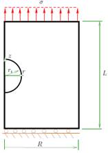 For simplicity, the hyper-elastic matrix is considered to be a cylinder of radius R and length L (see, for example, Figure 1). For a cylinder with one inclusion, it is assumed that the