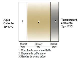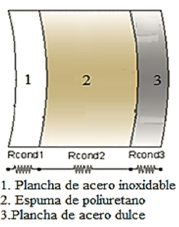 Para el cálculo de pérdidas en el tanque acumulador se realiza una analogía con redes de resistencias térmicas ya que el tanque está conformado por tres materiales como se muestra en la Figura 4. |