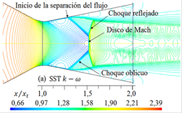 SST k − This model has the ability of forecasting the behavior of the compressible fluid with more precision for opposite pressure gradients, which in the simulations demonstrates where the front of the shock wave is present in the symmetry in the direction of the x axis. The sensitivity to abrupt pressure variations, which produce the separation of flow from the divergent wall, is slightly smaller with respect to the turbulence models k−e and RSM, which are closer to the experimental data. Nevertheless,