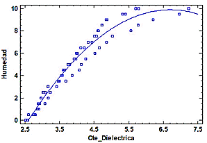 En este modelo el efecto lineal del coeficiente dieléctrico con respecto al valor de humedad esperado resulta significativo. En la tabla siguiente se muestran los resultados del contraste de hipótesis donde el «valor P» del efecto lineal es menor a 0.05. Se tiene un modelo de regresión lineal de R2 = 95.8057 % y un error estándar de 0.382134.
